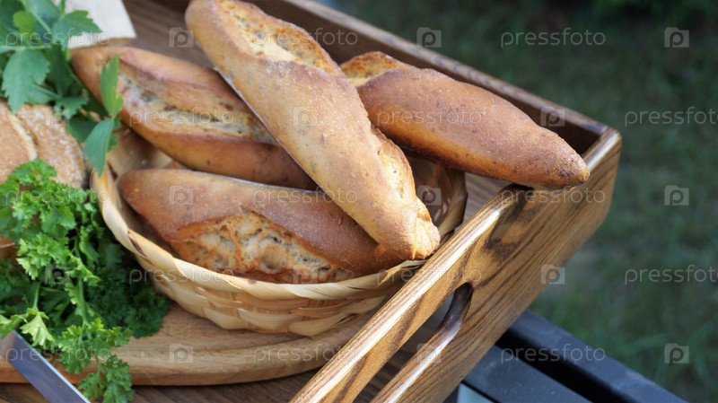 Различный хлеб на деревянном подносе с овощами