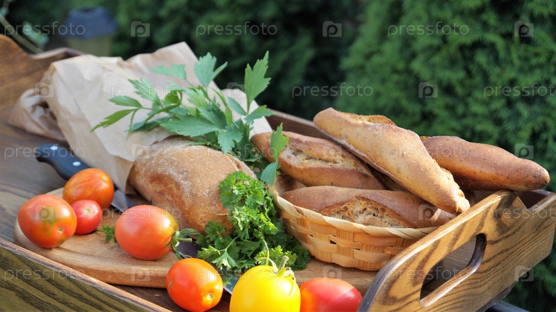 Различный хлеб на деревянном подносе с овощами