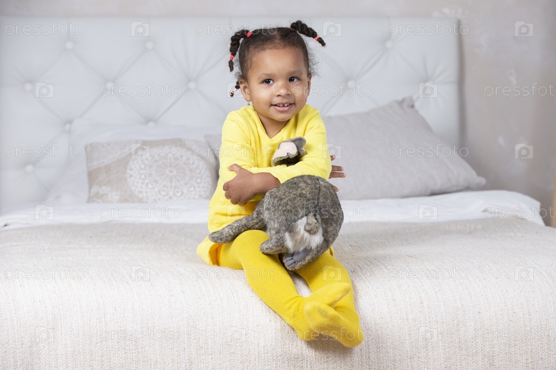Маленькая афроамериканка в желтом платье сидит на кровати с мягкой игрушкой
