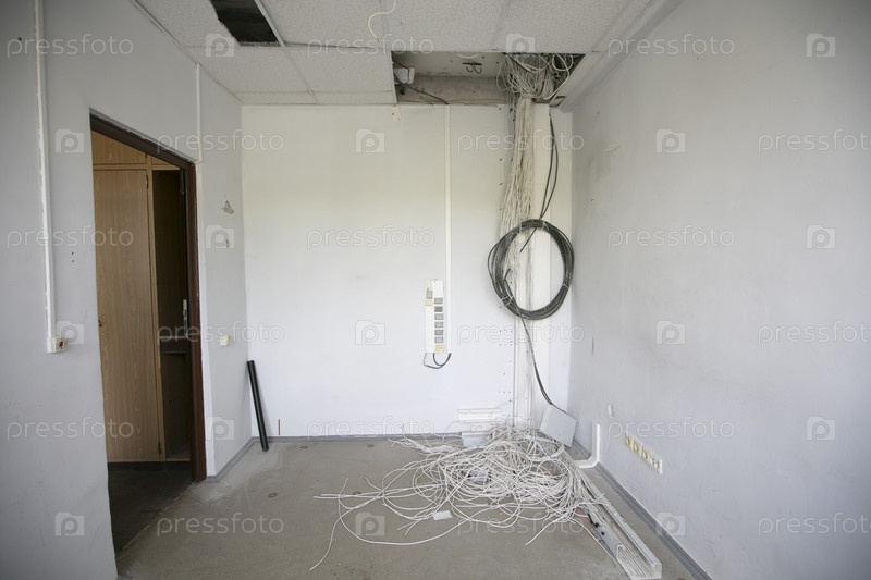 В пустом офисе с потолка свисает множество электрических проводов