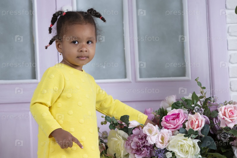 Маленькая афроамериканка в желтом платье трогает рукой букет цветов