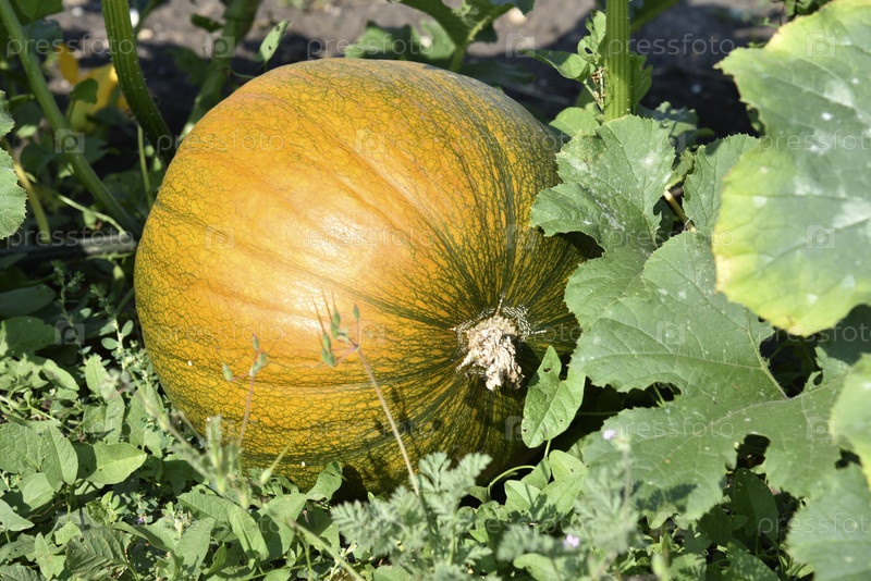 Оранжевая тыква в зеленом саду летом. Спелые плоды тыквы летом