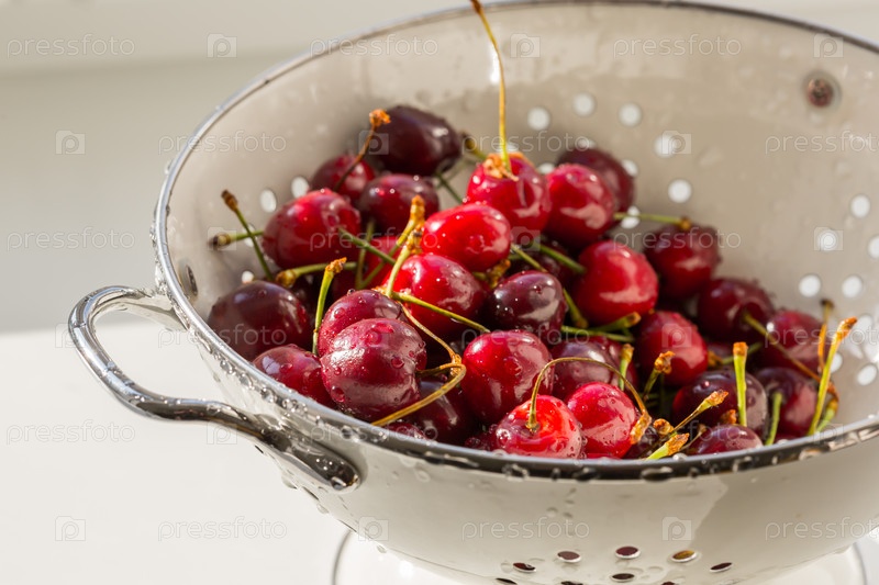 Свежая красная спелая органическая черешня в дуршлаге из белой стали