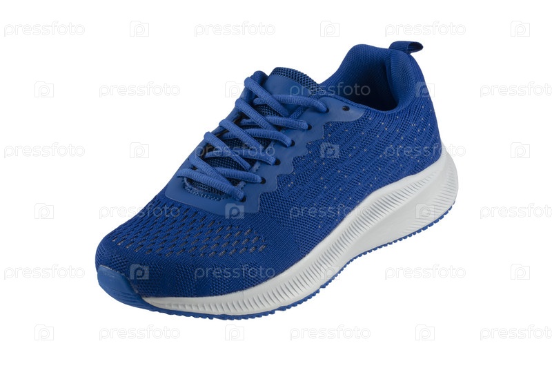 Синие кроссовки из ткани с белой подошвой на белом фоне. Спортивные туфли