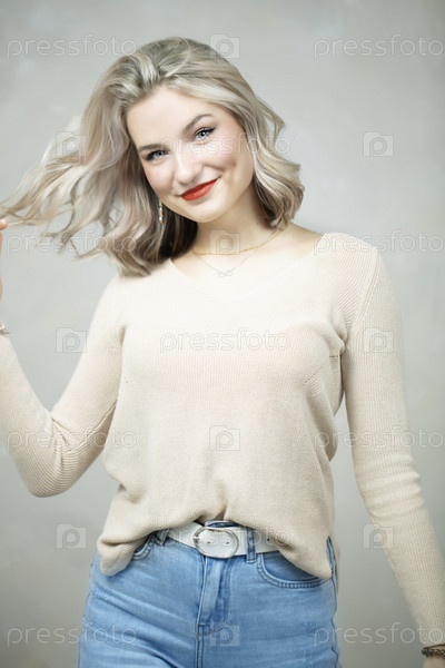 Красивая молодая блондинка в джинсах и бежевом свитере позирует перед камерой
