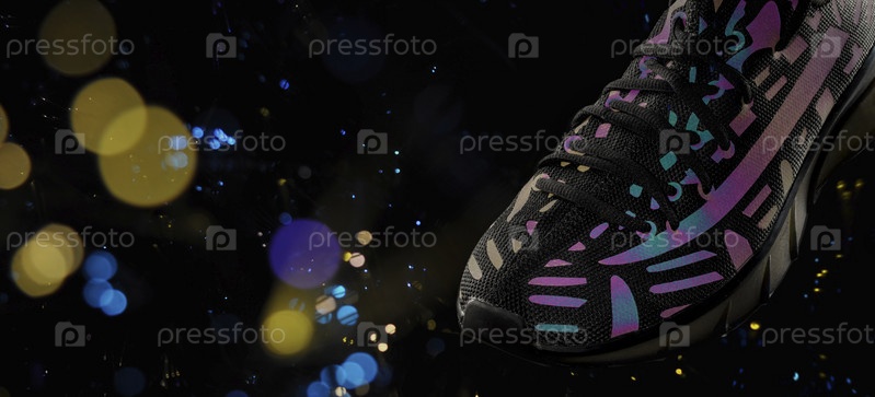 Часть черных кроссовок со светоотражающими элементами на черном фоне с боке. Спортивные туфли. Спорт или бег