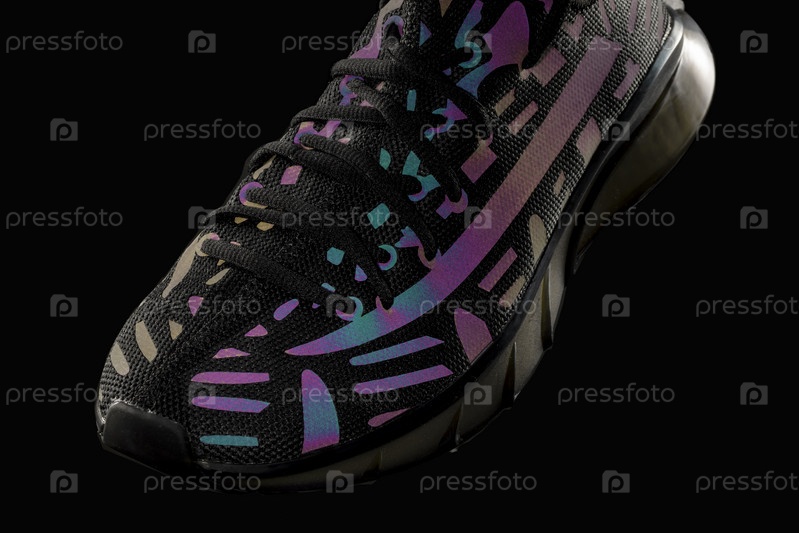 Часть черных кроссовок со светоотражающими деталями на черном фоне. Спортивные туфли. Спорт или бег