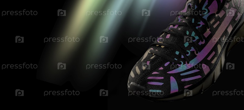 Часть черных кроссовок со светоотражающими деталями на черном фоне. Спортивные туфли. Спорт или бег