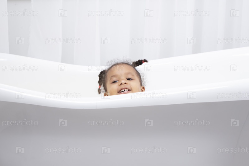 Забавная маленькая африканская девочка выглядывает из белой ванны и улыбается