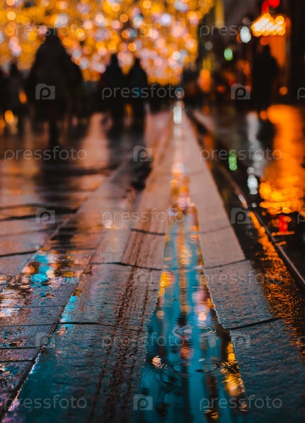 Дождливая ночь в большом городе, отражение красочных городских огней на мокрой поверхности дороги. Вид с уровня улицы на ноги пешеходов. абстрактный фон. расфокусированный, глубина резкости, боке