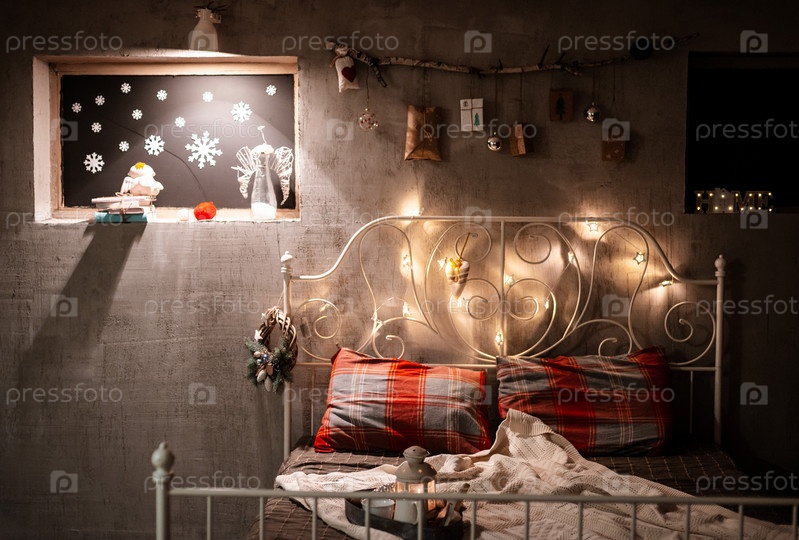 Новогоднее украшение спальни в стиле лофт, серый бетон и палка с подарками, висящими на стене