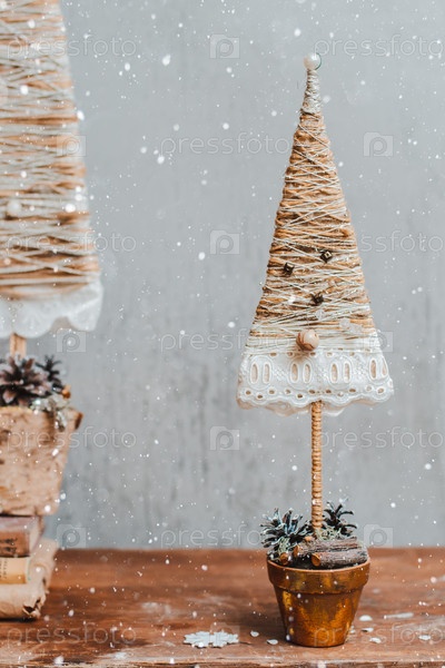 Текстильная елочка в горшке ручной работы. Бетонный серый фон. Новогодние украшения своими руками. Новогодние украшения своими руками. Свободное место для текста