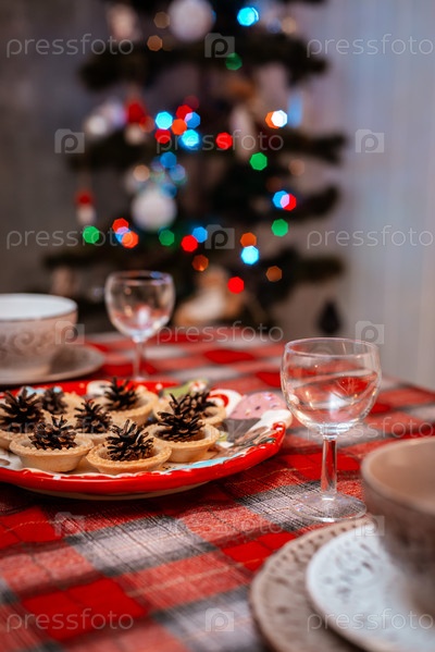 Традиционно украшенный рождественский стол. Креативное оформление праздничного стола шишками на тарелке на фоне огней боке