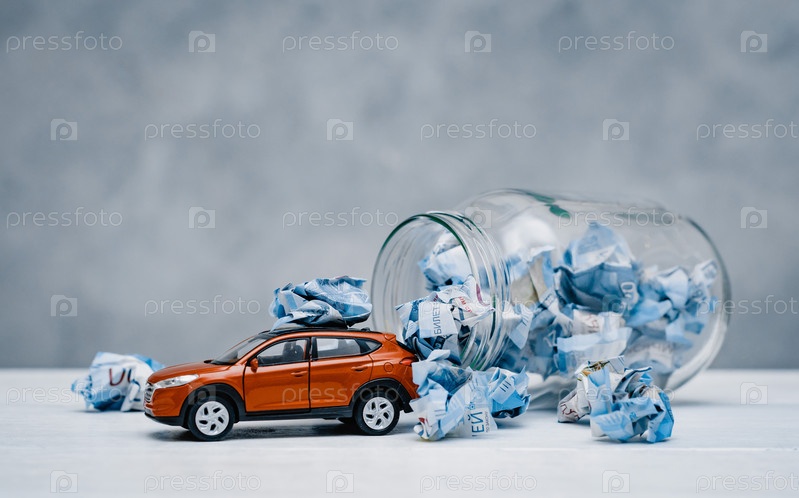 Бумажные скомканные деньги в стеклянной банке на синем фоне концепции, чтобы сэкономить и сэкономить деньги на автомобиль. Свободное место