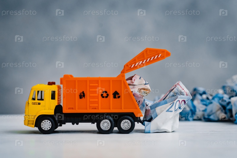 Оранжевый игрушечный мусоровоз выгружает скомканные бумажные банкноты на белом столе на синем фоне. Денежный мусор, свободное место