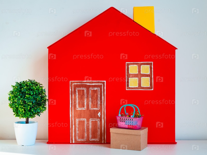 Красный декоративный дом с игрушечными посылками и продуктами. Доставка бесконтактных коробок и продуктов. Концепция бесконтактной доставки в период карантина по коронавирусу