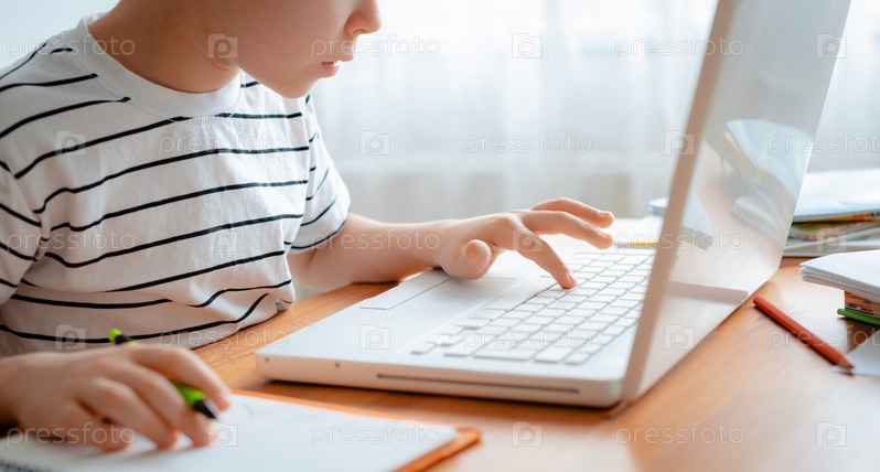 Дистанционное обучение онлайн образование. Школьник учится дома и делает домашнее задание. Домашнее дистанционное обучение