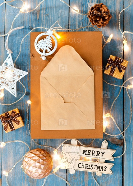 Новогодние украшения вокруг рождественского письма пустое место для текста горящие огни гирлянды на синем деревянном фоне