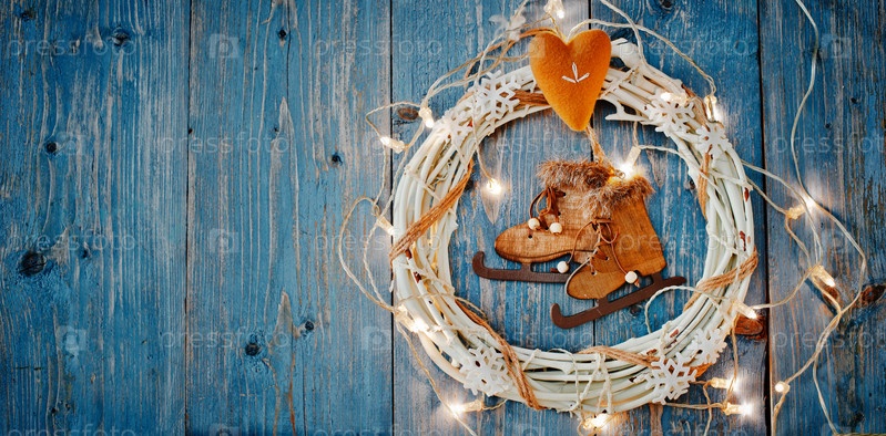 Новогодние украшения вокруг рождественского письма пустое место для текста горящие огни гирлянды на синем деревянном фоне