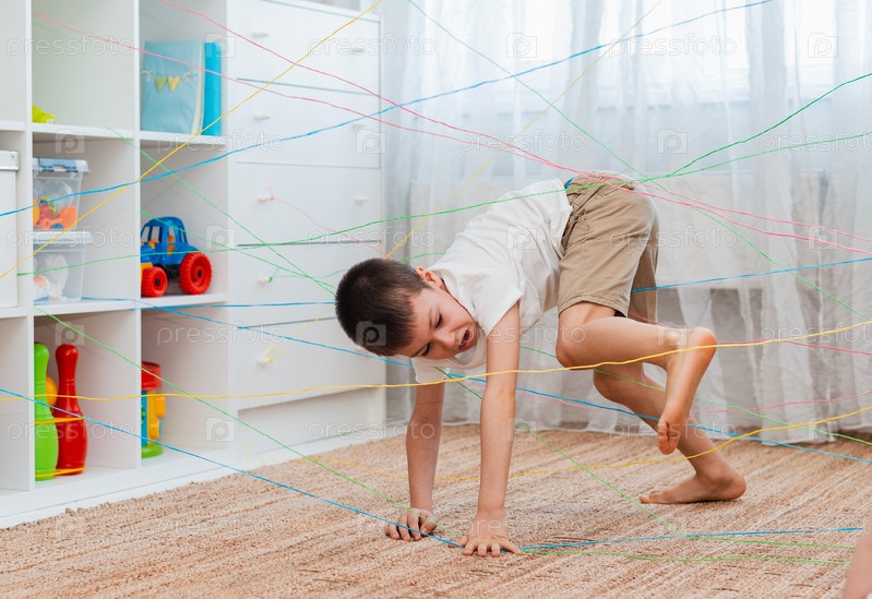 Мальчик-брат, братья и сестры, друг лезет через веревочную паутину, игровой квест с препятствиями в помещении