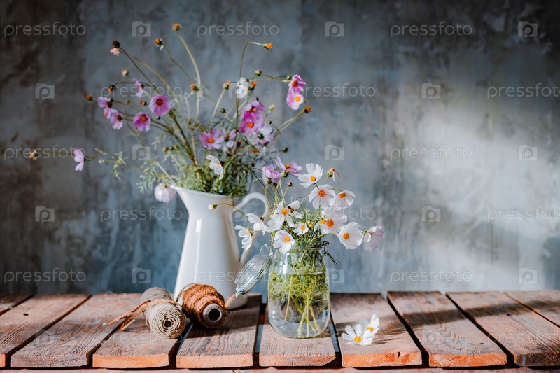 Красивые букеты полевых цветов на деревянном столе на фоне холодной бетонной стены