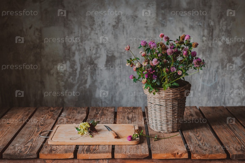 Красивые букеты полевых цветов на деревянном столе на фоне холодной бетонной стены