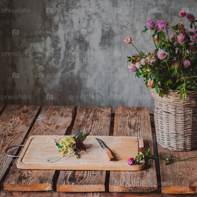 Красивые букеты полевых цветов на деревянном столе на фоне холодной бетонной стены