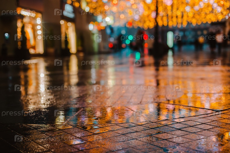 Дождливая ночь в большом городе, отблески огней на мокрой поверхности дороги. Вид с уровня улицы. Пешеходные ноги и абстрактный фон