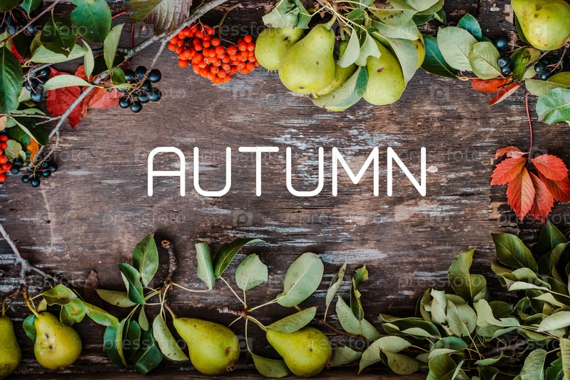 Красно-черная рябина с грушевыми ветвями и осенними листьями на текстурированной старой деревянной поверхности