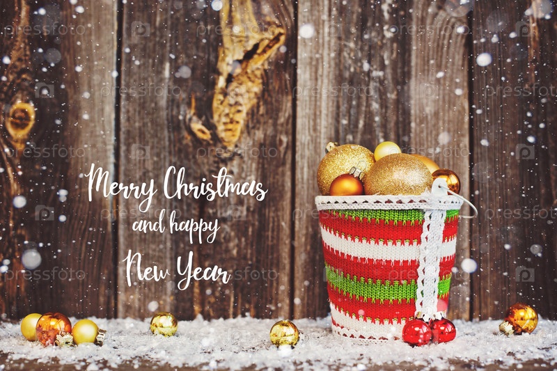 Рождественская композиция из ведра украшений с золотыми елочными украшениями на старом коричневом деревенском деревянном фоне