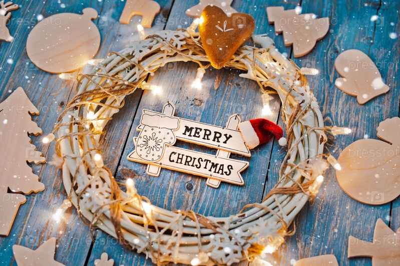 Новогодние украшения вокруг рождественского письма пустое место для текста горящие огни гирлянды на синем деревянном фоне. Вид сверху. Плоская укладка. копировать пространство коричневый деревенский стиль