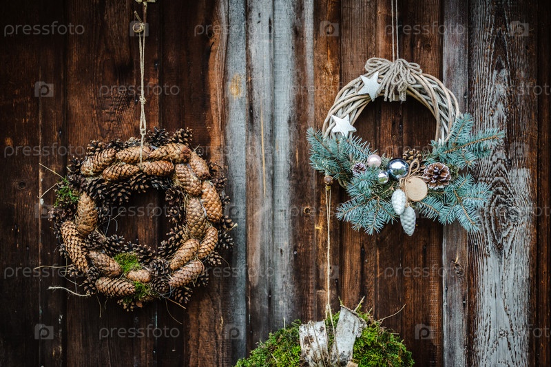 Праздничный деревенский венок из шишек на темно-коричневом деревянном фоне. Концепция праздника Рождества и Нового года