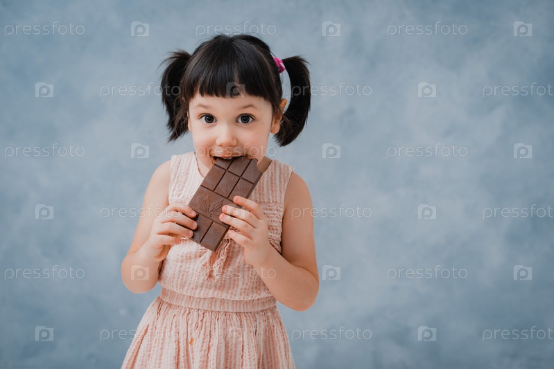 Маленькая девочка ест шоколад и облизывает палец на фоне серо-голубой студии. свободное место
