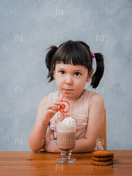 Маленькая девочка пьет горячий шоколад или какао с печеньем через коктейльную трубку на сером фоне за столом