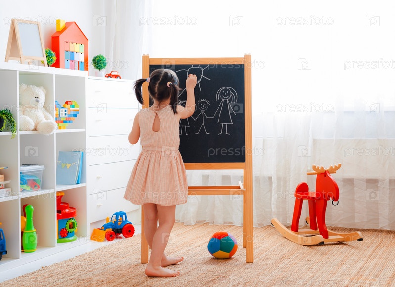Девочка стоит в детской комнате с доской и рисует мелом семью
