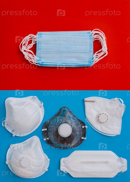 Белый сорт медицинской маски респиратор синий красный фон. маска для лица защищает от загрязнения окружающей среды вирусами гриппа, коронавирусом. Хирургическая концепция здравоохранения. выбор выбор, вариант альтернатива