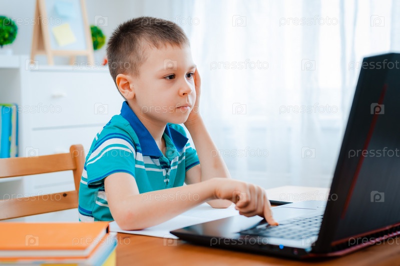 Дистанционное обучение онлайн образование. Школьник учится дома и делает домашнее задание. Домашнее дистанционное обучение