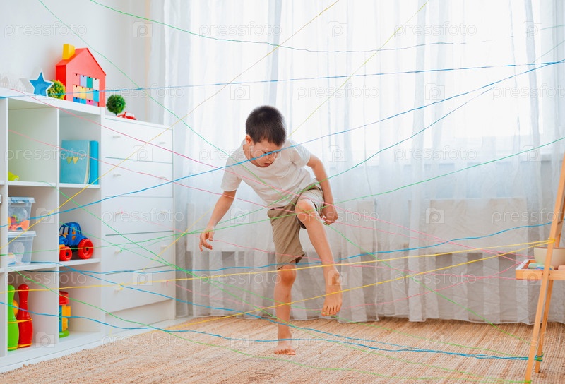 Мальчик-брат, братья и сестры, друг лезет через веревочную паутину, игровой квест с препятствиями в помещении