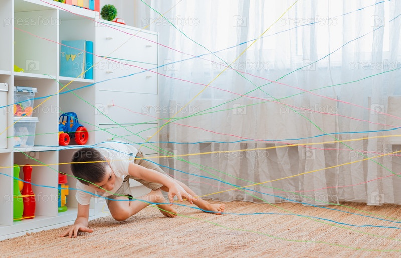 Мальчик-брат, братья и сестры, друг лезет через веревочную паутину, игровой квест с препятствиями в помещении