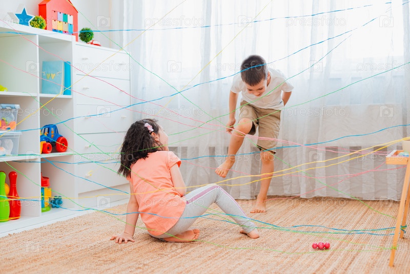 Маленькая девочка, мальчик, брат, братья и сестры, друг карабкается по веревочной паутине, игровой квест с препятствиями в помещении