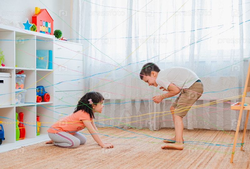 Маленькая девочка, мальчик, брат, братья и сестры, друг карабкается по веревочной паутине, игровой квест с препятствиями в помещении