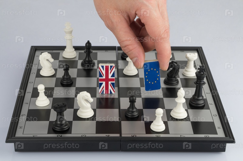 Рука политика поднимает фигуру с флагом Европейского союза Концепция политической игры и шахматная стратегия Brexit