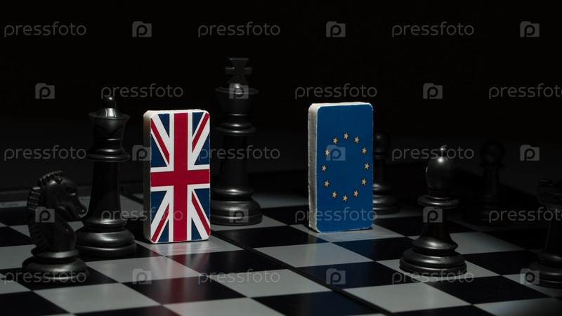 Подсвеченные в тени фигуры и флаги Европейского Союза и Великобритании на шахматной доске.Концепция политической игры и шахматная стратегия Brexit