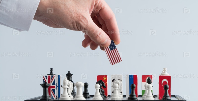 Рука политика двигает шахматную фигуру с флажком. Концептуальное фото политической игры. ответный ход США