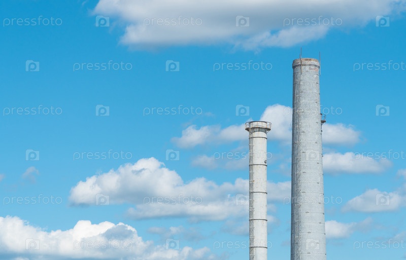 Трубы промышленного предприятия на фоне голубого неба с облаками. Дымоход без дыма