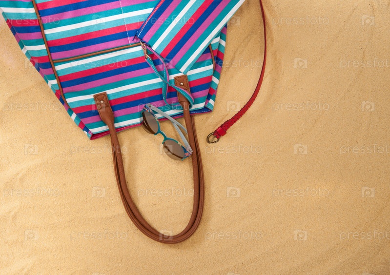 Комплект яркой летней одежды для пляжа на золотом песке. концепция летнего сезона и отдыха. вид сверху