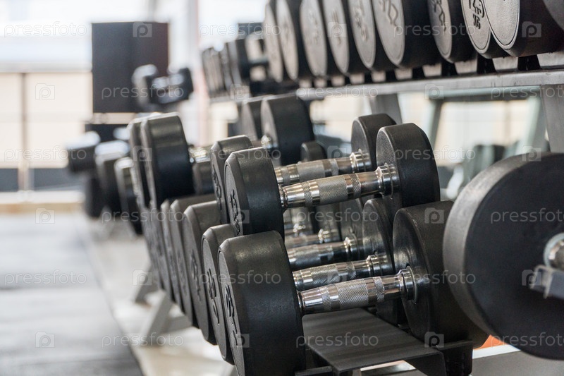 Ряд гантелей в современном тренажерном зале