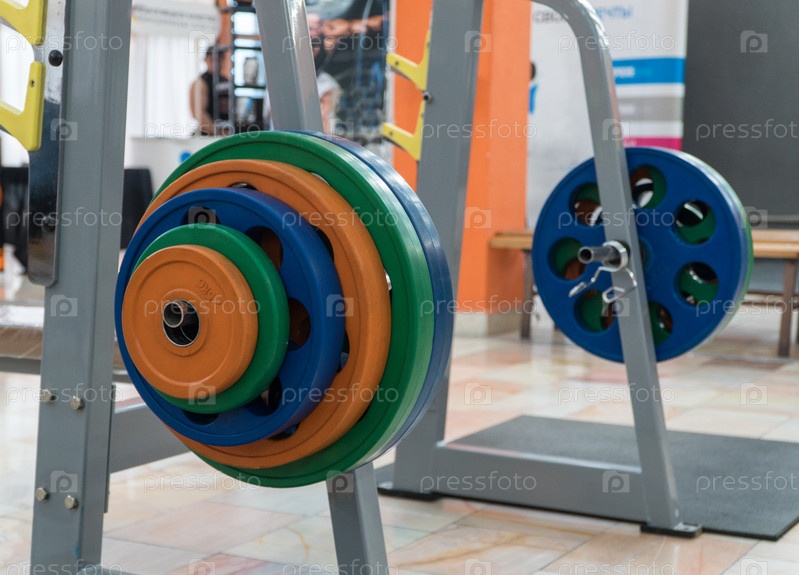 Спортивный инвентарь и штанги в тренажерном зале, крупный план