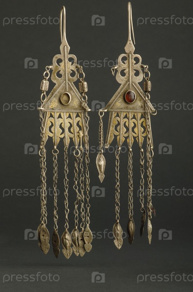 Древние старинные серьги с камнями на черном фоне. Среднеазиатские винтажные украшения