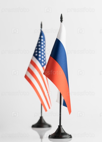 Флаги США и России на белом фоне изолированы. Концепция политики